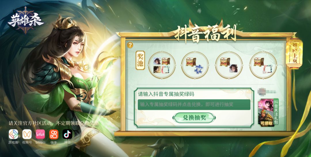 今日绿码:玖零玖零伍,大家快快前往游戏内进行兑换吧。后续抖音专属抽奖绿码只能在英雄杀抖音官号中获取,记得多多留意抖音官号的视频动态呦~