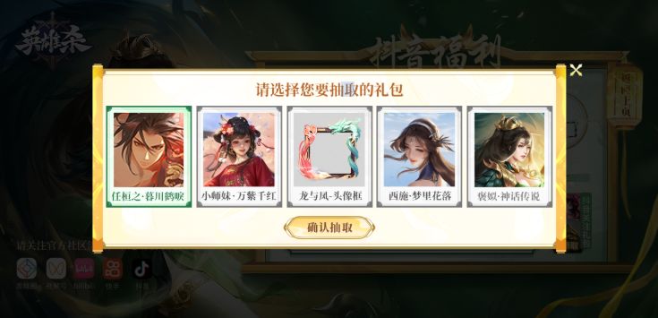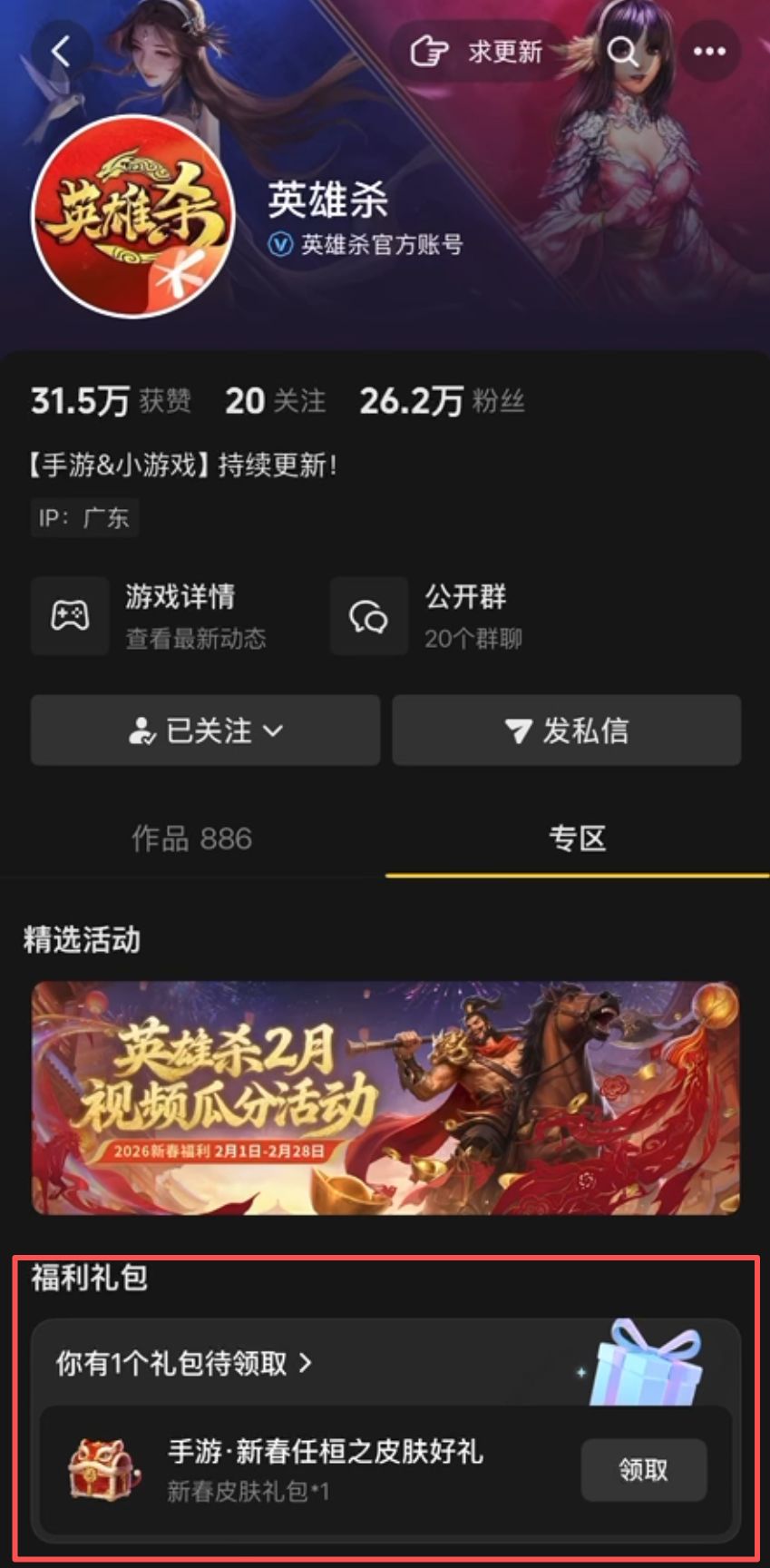 抖音新春关注礼限时放送,关注英雄杀抖音官号即可立即领取任桓之新春皮肤礼包!