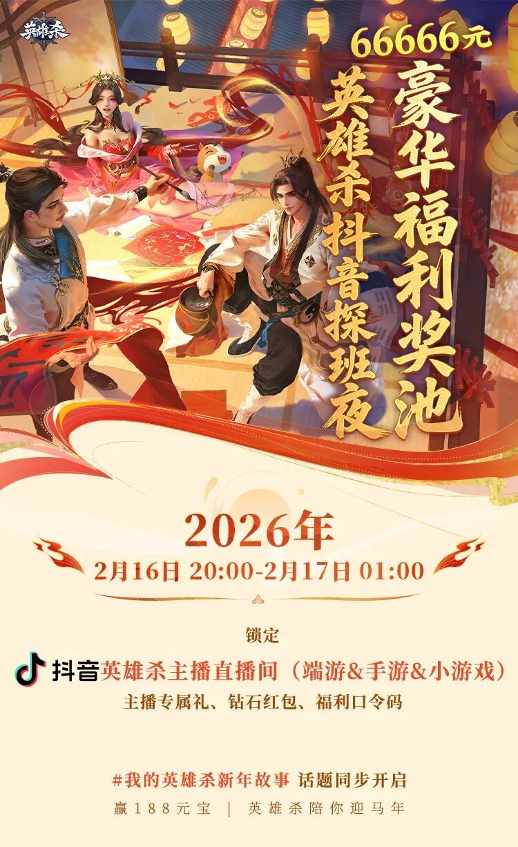 抖音带 #我的英雄杀新年故事 话题(2月16日-3月3日),分享你与英雄杀的新年回忆、游戏趣事,活动结束后,小师妹将翻牌10条优质内容,各送188元宝福利!