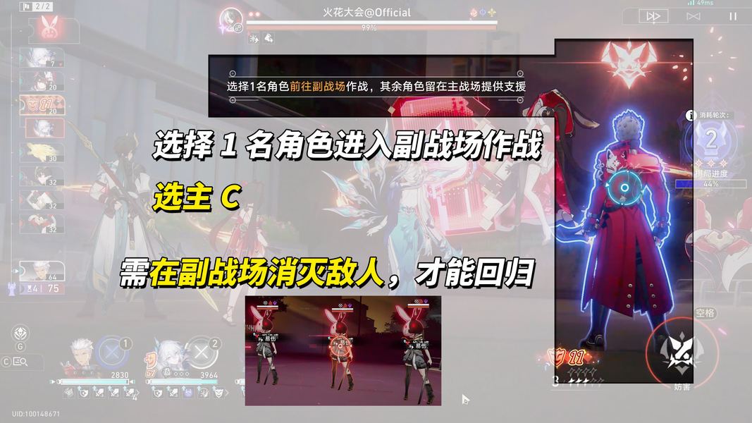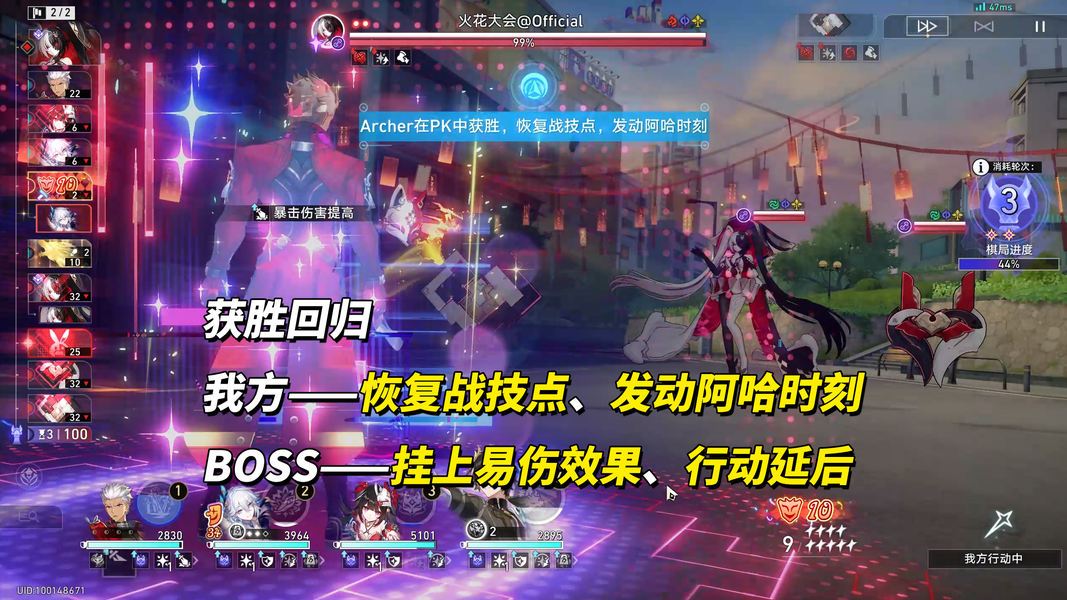 副战场内的角色,在PK单位行动前消灭敌方全体,回归主战场,并使获得易伤效果、我方发动1次阿哈时刻、恢复战技点;