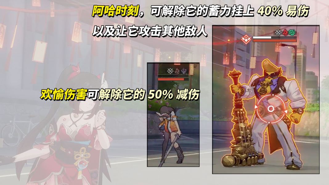 ①摇滚狂徒。我方发动阿哈时刻,可打断它的蓄力技能获得10笑点使其挂上40%易伤,同时使它陷入狂奏状态攻击其他敌人。