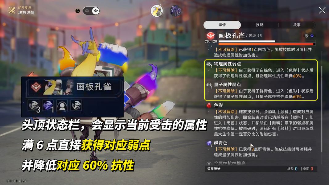 第1波有一个生面孔“画板孔雀”,会记录受击属性,每次受击积攒1点对应属性颜料(欢愉伤害额外2点),满6点获得对应属性的弱点以及60%抗性降低,记录期间需保证有挂上主C属性。