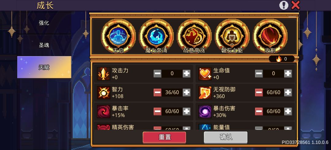 天赋加点:无视防御、命中率、暴击率、暴击伤害、精英伤害、伤害减免、移速加成、觉醒技能伤害、技能减耗、智力、攻击力