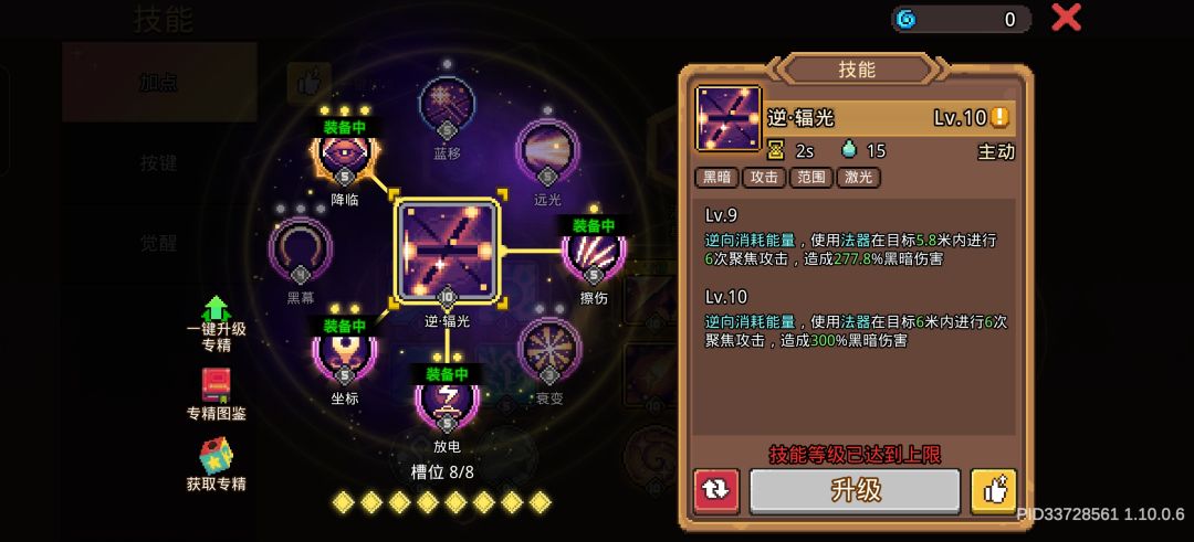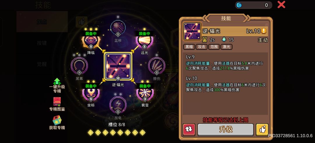 降临、坐标、衰变都可提高伤害,远光扩大攻击范围,可打到屏幕外的敌人