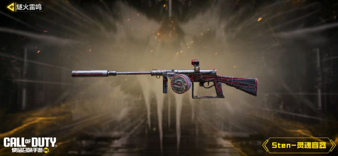 Sten-灵魂容器的圆盘弹鼓如同嵌入枪身的猩红眼球,无数血管状纹路从弹鼓向枪托和握把蔓延缠绕,将冰冷的金属枪身异化为有机与机械交织的诡异生命体。