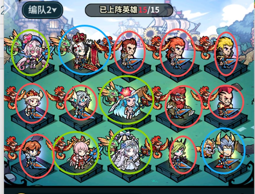 加成完毕,下面我们梳理阵容搭配。可以清楚看到,战士金币加成最大为200%,法师和弓箭手为120%。其他加成都一样。所以我们可以多选用平时不玩的战士(下图红圈所示)上阵,可以获取较高金币加成,减少英雄破产的情况出现。但是这些战士练度比较低,往往嘎的比较快,那么我可以安排两个攻击力相对较弱的主坦(下图篮圈所示)承担伤害,同时为了提高战士们的生存能力,较大的消耗饥饿、疲劳、心情,提高收益,可以编入部分治疗职业。具体数量,要实测1小时净化之力消耗和绷带消耗。控制在390-430之间最佳,绷带消耗要收入数量和消费数量达到平衡。