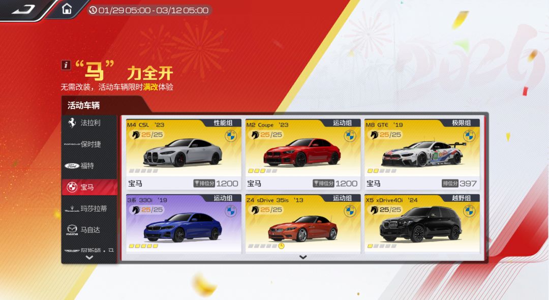 1月29日维护后至3月12日05:00,法拉利、保时捷、宝马等多款豪车品牌限时解锁满改权益!无需消耗任何改装零件,车辆性能直接拉满至最高等级,零成本就能畅爽体验满改快乐!(请车手们认准马头标志哦~)