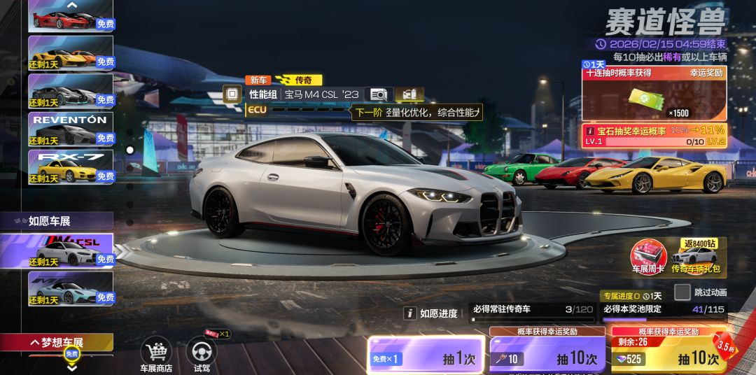 现在前往巅峰车展,就能把这台赛道怪兽宝马 M4 CSL '23带回家!本次车展将在2月15日04:59正式结束,十连抽还有概率获得梦想奖券*1500,现在登录还能领取每日免费1抽福利可别错过!