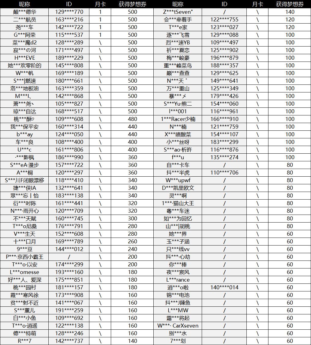 单周排行榜奖励:单轮第1-3名分别获得100/80/60张梦想奖券;每周总榜单前4名额外各获月卡1张;