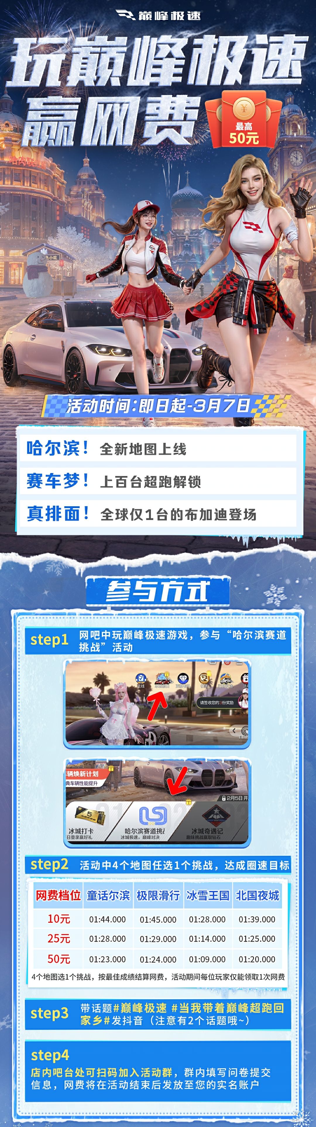 即日起-3月7日,车手们可以前往全国指定合作网吧挑战“哈尔滨赛道”,就能轻松赢取最高50元网费奖励,快来点击下方图片解锁你的假期福利呀!