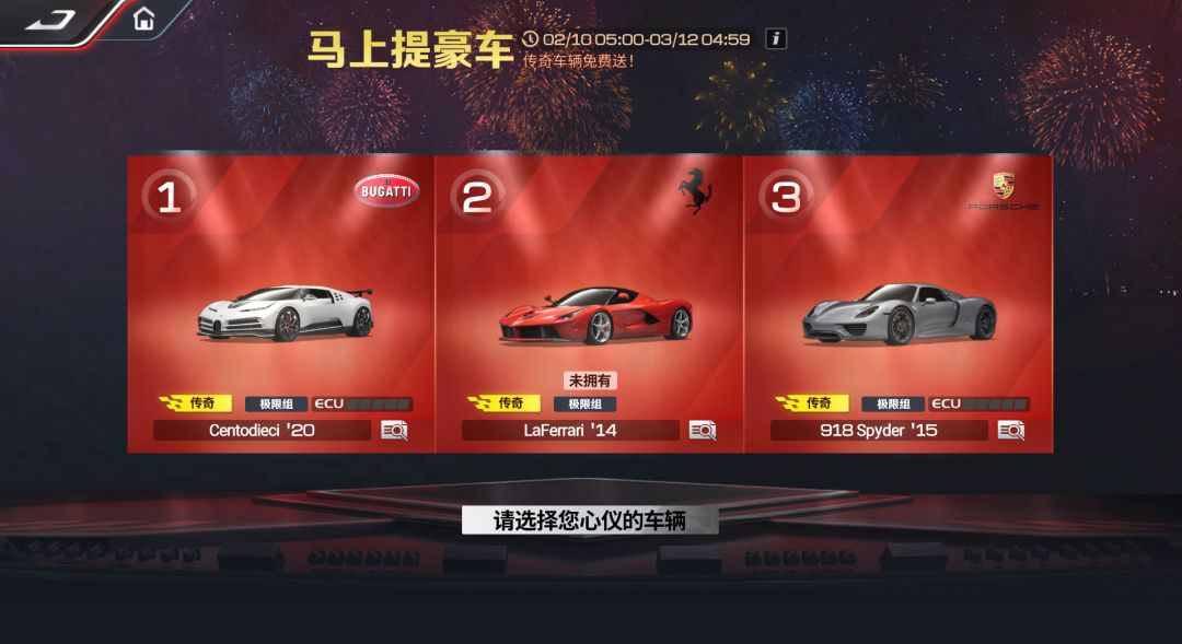 即日起,车手们登录游戏即可参与【马上提豪车】活动,免费领取一辆【极限组】限定车辆,可选车型涵盖法拉利 LaFerrari '14、保时捷 918 Spyder '15、布加迪Centodieci '20,三款豪车任选其一!