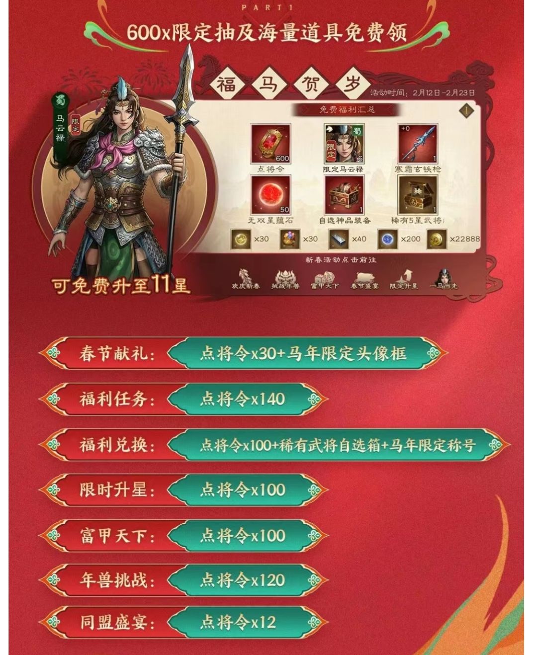 新春福利活动–600点将令获取详解攻略!轻松抽取12星马云禄!