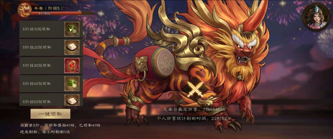 年兽每阶能获取5个点将令。目前2天时间打了4阶年兽,预估12天活动时间可打至24阶年兽,总共可获得120个点将令(数量无误)