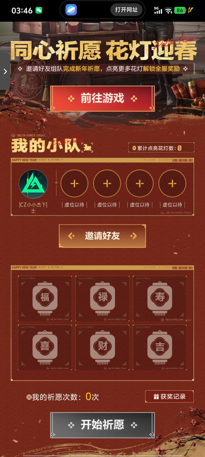 三角洲新春祈愿限时启动,快来与我组队赢烟花与拼手气红包吧!我的小队ID:【E1000381340_1】,点击链接与我组队,邀请链接: