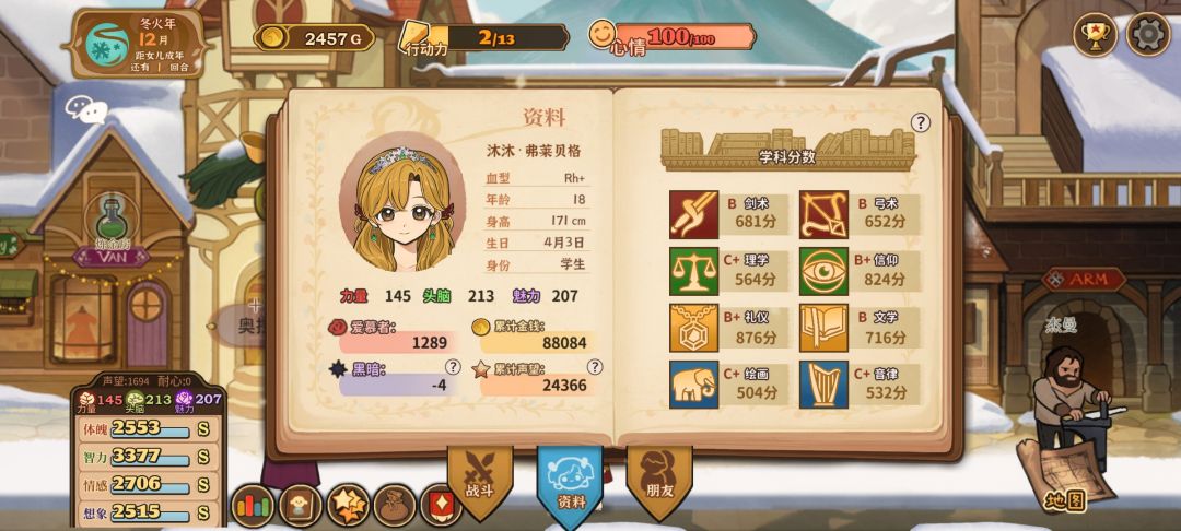 这次主要倾向于脑力,智慧的天赋,导师和主要攻略对象是克劳德(但总感觉有一些距离感呢…)