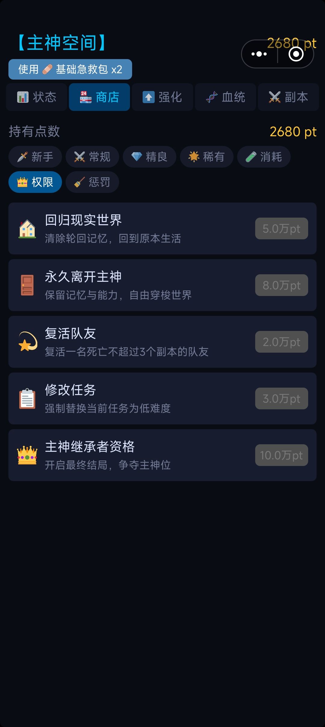 感觉还行,有点无限流的味道了,就是最后永久离开主神和争夺主神继承资格我都买了,没什么反应,应该是还没实装。想提高属性可以刷那个原型机c级副本,全属性+3、精神还额外加+7,多刷刷就好了