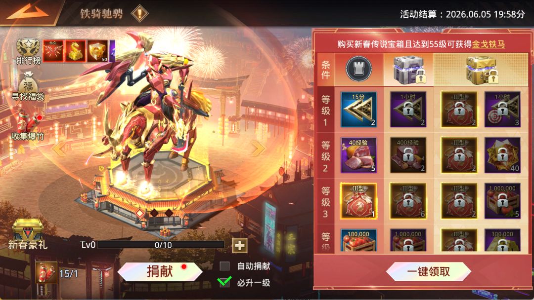 活动期间,指挥官可通过捕捉巨兽、攻打兵团获取大量战令道具【爆竹】,捐献【爆竹】即可提升战令等级。