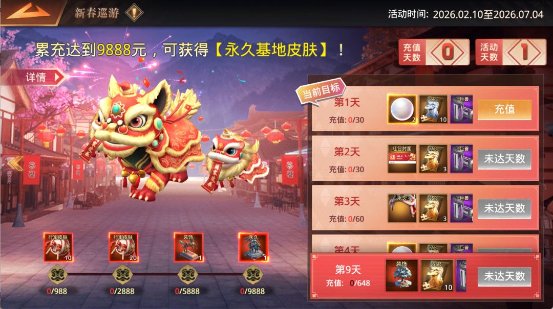 活动期间,指挥官达成指定累充目标,即可领取对应累充奖励,奖励包含【新春基地皮肤】、【赤红战马装饰】、【新春行军皮肤】等珍稀大奖。