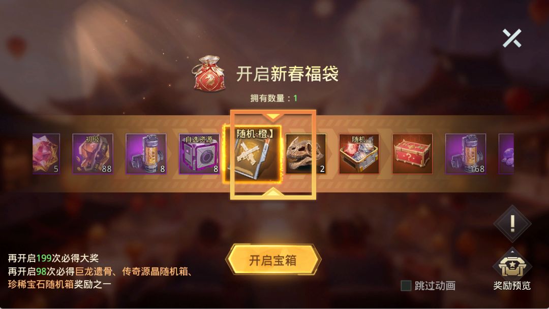 达到指定抽奖次数可领取累计进度奖励,内含大量珍稀养成材料与限定时装,包括【春节麒麟皮肤】、【翼装图纸】、【春节装饰】、【琉璃神石】等(不同开服天数奖励有所不同)。