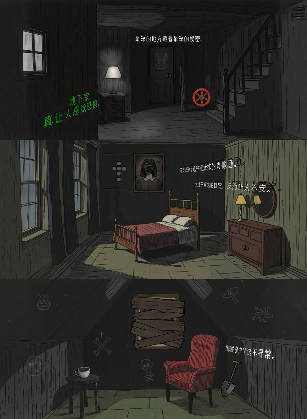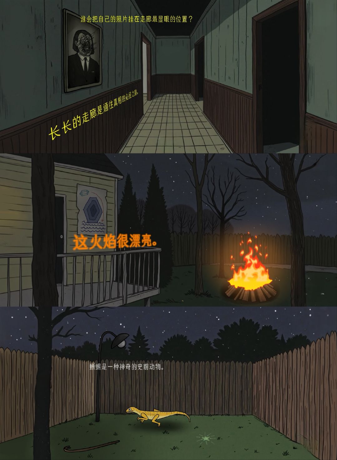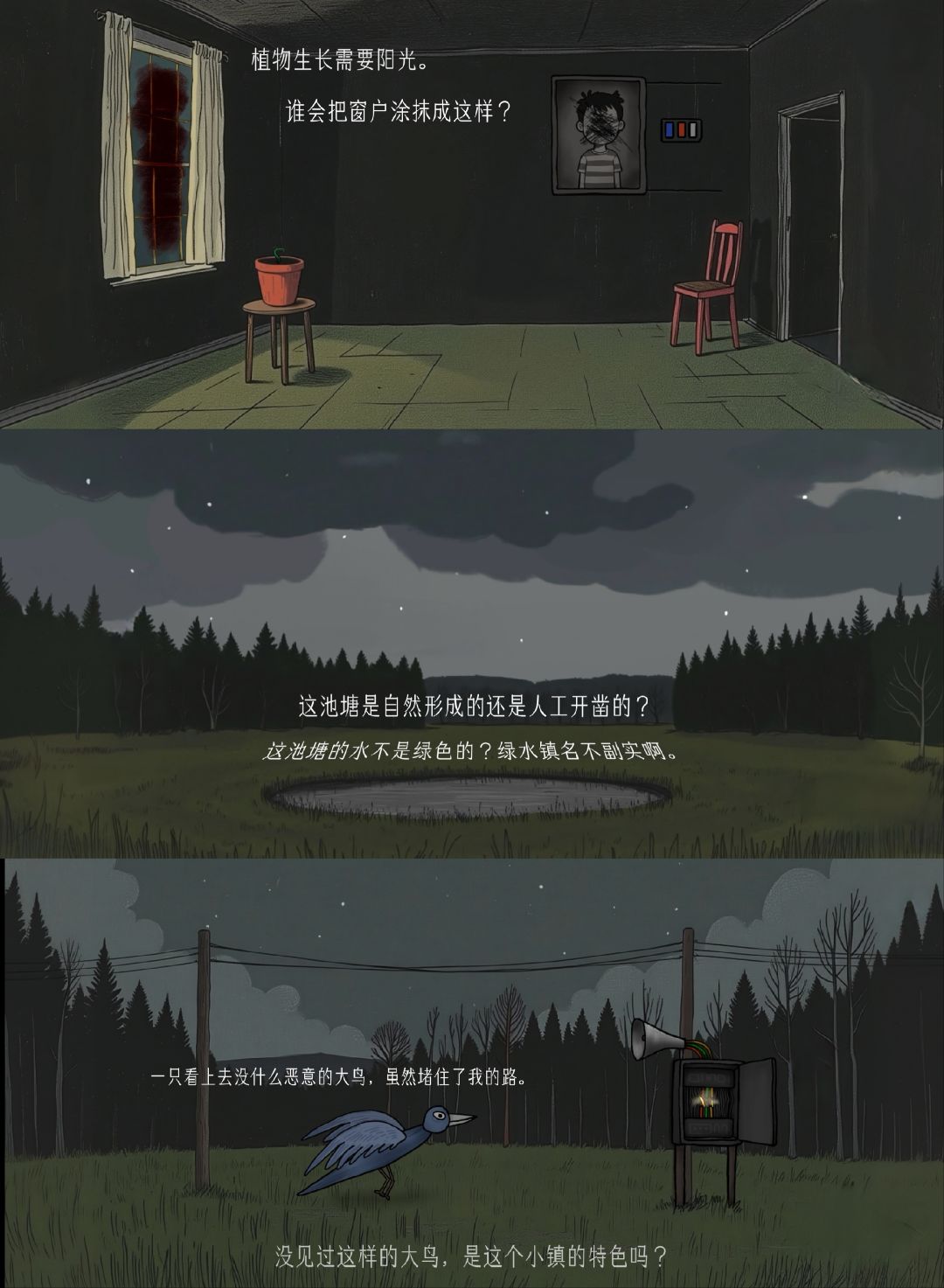 因为游戏要钱,所以等到现在才玩。挺简短的解谜游戏,阴森的场景搭配主角充满疑惑的心声文字、变幻起伏的背景音乐,让这个游戏满是诡异氛围。主角是一名专业侦探,收到一封夹着奇怪照片的信和木盒,这些都与一个叫绿水镇的地方有着关联。在驱车快到达这个地方时,车子坏了。主角随即开始探索这个空无一人的诡异小镇。但在不知不觉中,主角竟完成了恶魔的献祭仪式,成为诡异照片中的一员。