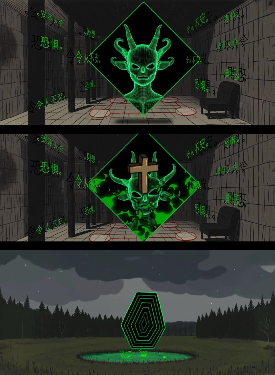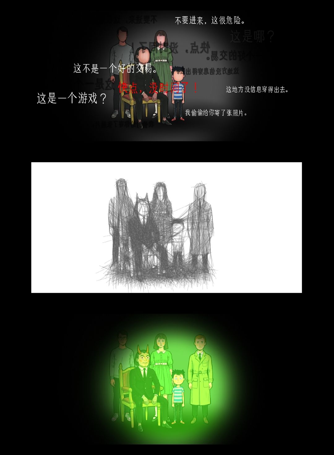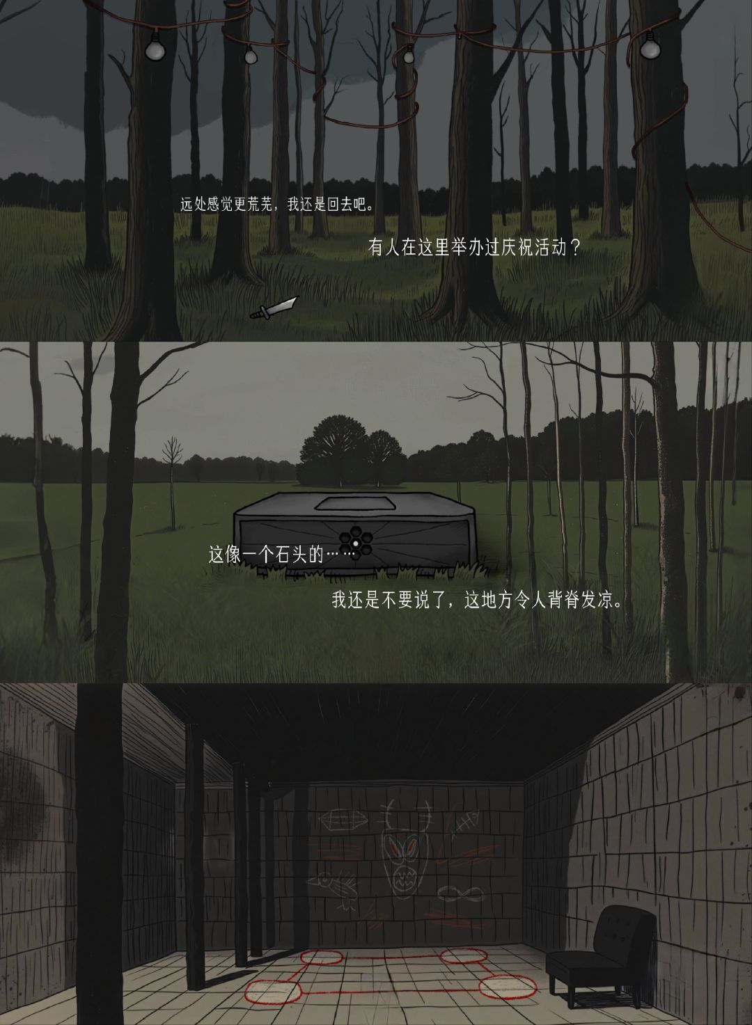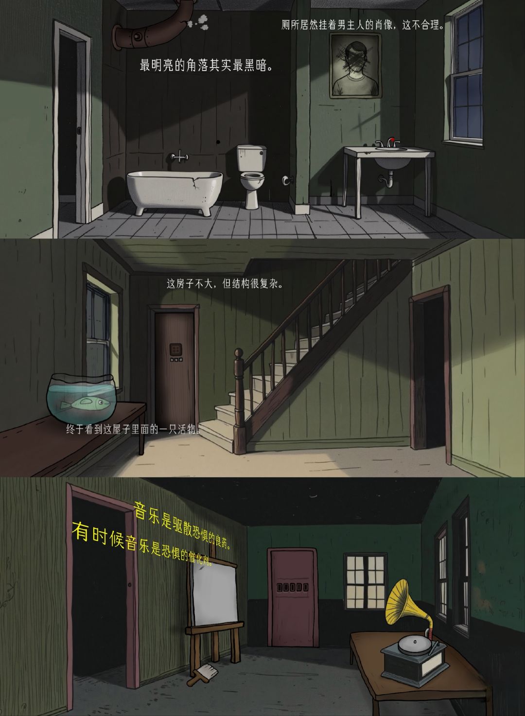 因为游戏要钱,所以等到现在才玩。挺简短的解谜游戏,阴森的场景搭配主角充满疑惑的心声文字、变幻起伏的背景音乐,让这个游戏满是诡异氛围。主角是一名专业侦探,收到一封夹着奇怪照片的信和木盒,这些都与一个叫绿水镇的地方有着关联。在驱车快到达这个地方时,车子坏了。主角随即开始探索这个空无一人的诡异小镇。但在不知不觉中,主角竟完成了恶魔的献祭仪式,成为诡异照片中的一员。