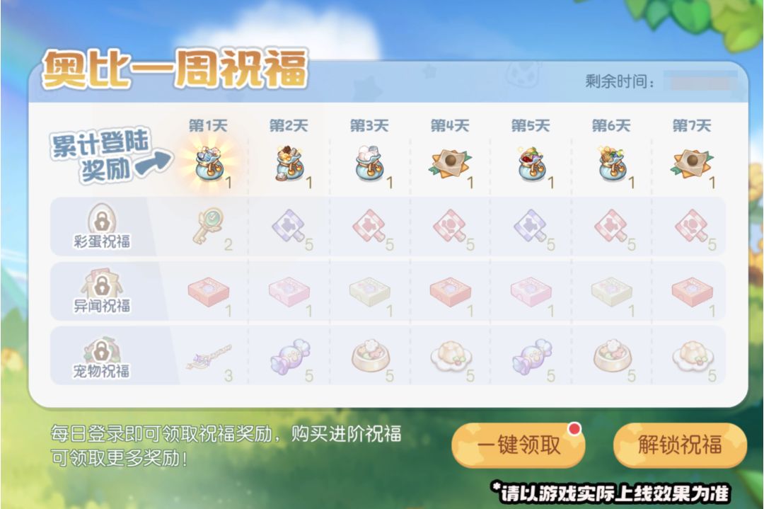 活动介绍:活动期间内,奥比们通过每日登录即可领取7日祝福奖励。购买进阶祝福(本次含:彩蛋祝福/异闻祝福/宠物祝福),还可获得对应祝福的更多奖励哟!
