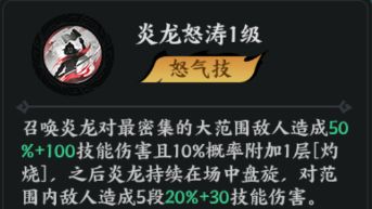 周瑜的怒气技打的是针对性的范围伤害,召唤炎龙在敌方最密集的地方造成伤害并有概率附加【灼烧】,随后造成二段伤害。激活觉醒技后,释放怒气技造成击杀可以增加炎龙的持续时间,并额外造成伤害。