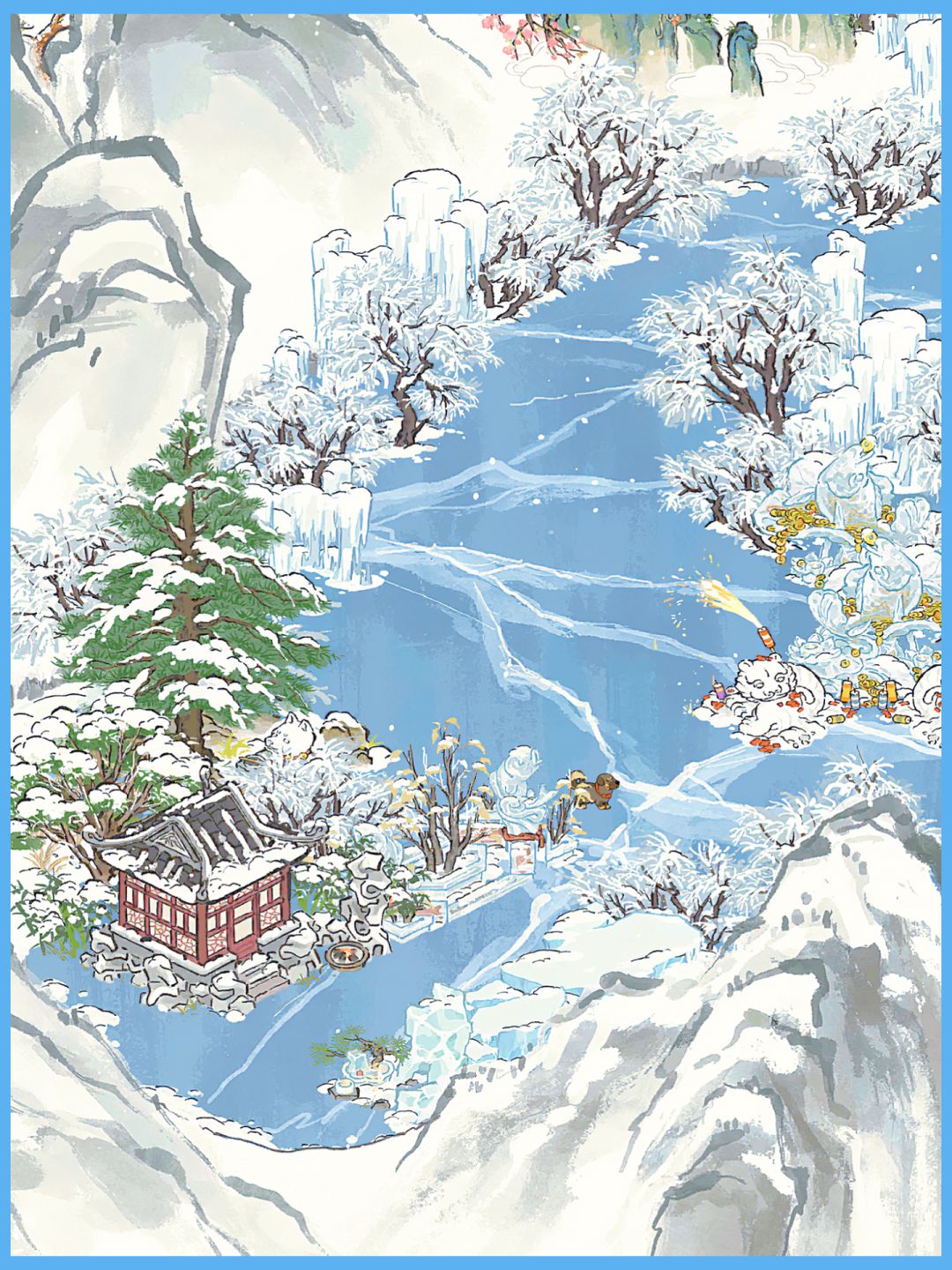 建筑:停鹤台、流云岩、青松岩、饵料小屋、雪宠伴松、山中归雪屋