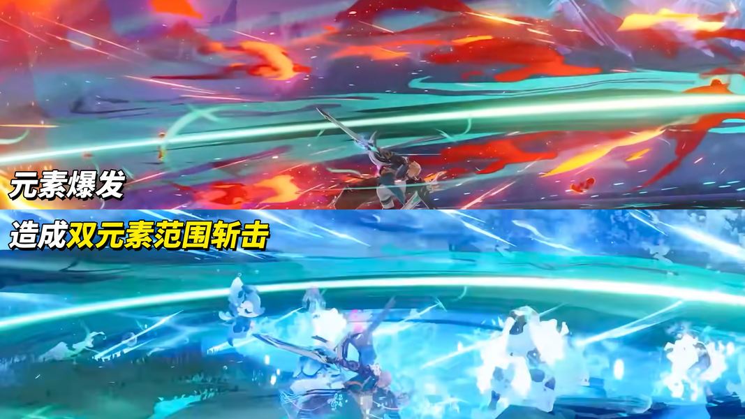 元素爆发则是纯粹的爆发技能,挥舞大剑造成大范围的双元素两连斩。