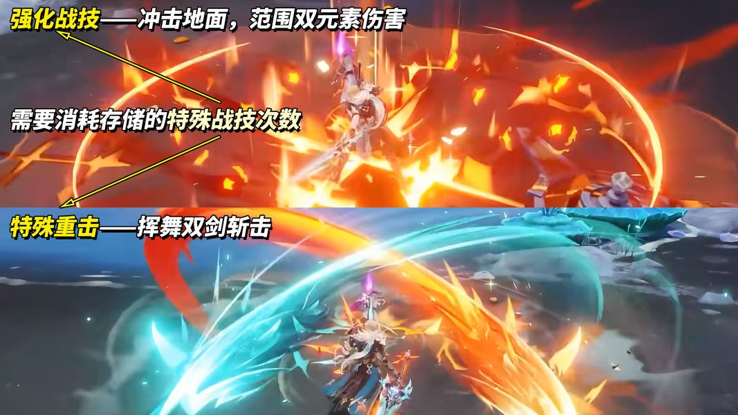 在此期间法尔伽会解锁强化战技「四风将起」,施放可冲击地面造成范围双元素伤害。也可选择消耗战技可用次数进行强化,施放特殊重击「苍噬」,造成双元素斩击。