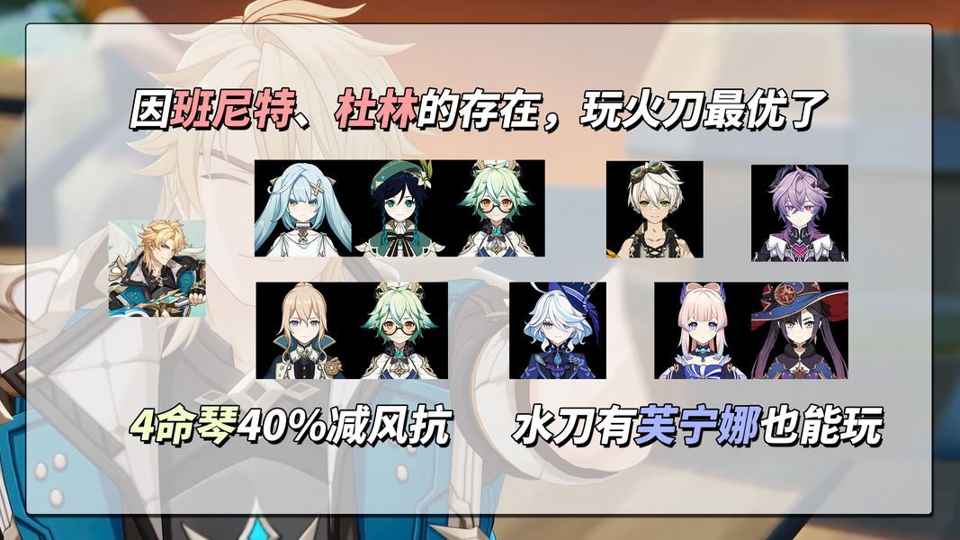 目前思考下来最推荐【火刀】组合“法尔伽+珐露珊/温迪/砂糖+班尼特+杜林”。攻击、减抗、生存都有;