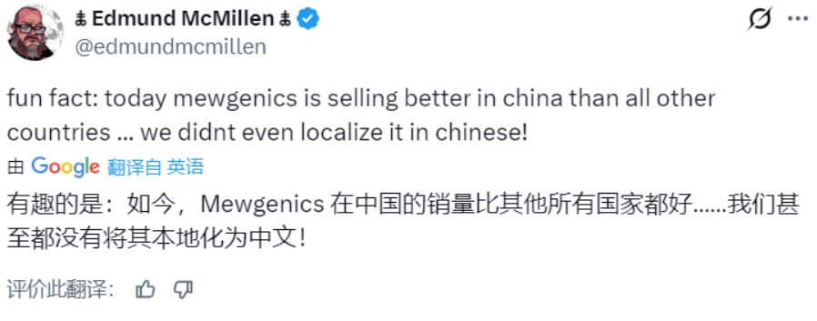 《喵喵的结合》开发者Edmund McMillen在社交平台官宣,即便游戏首发未支持简体中文,中国市场销量依旧位列全球第一。另一开发者Tyler Glaiel同步透露,本作全球累计销量已突破65万份。
