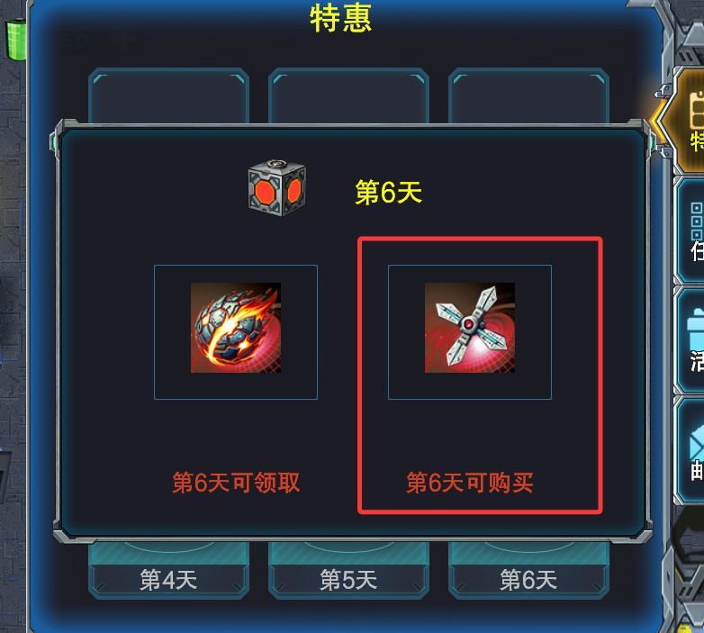 另外建议新人,在第6天的时候,可以免费领取1个红色装备风火轮,然后用做任务获得的氪石买一个红色装备“原子切割”。
