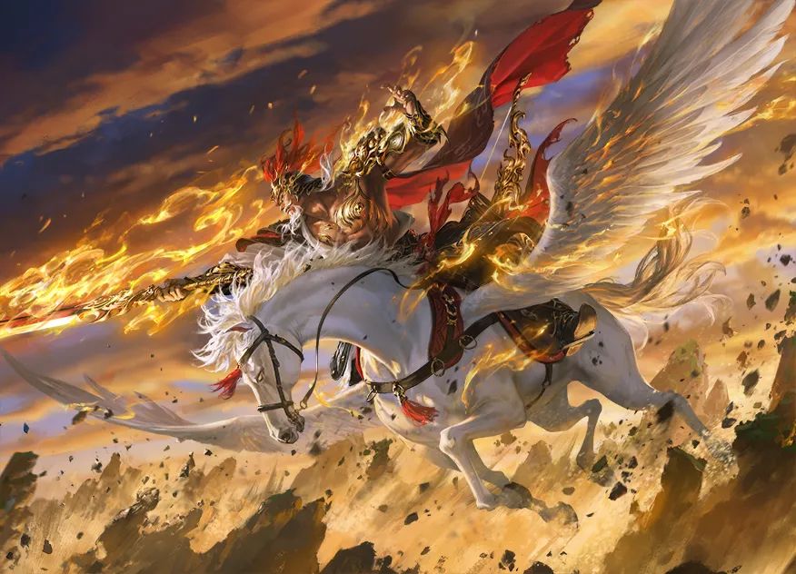 白马鬃毛飞扬,蹄下烈焰翻涌