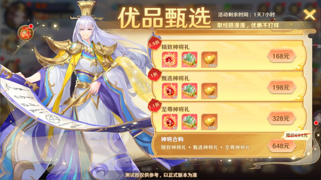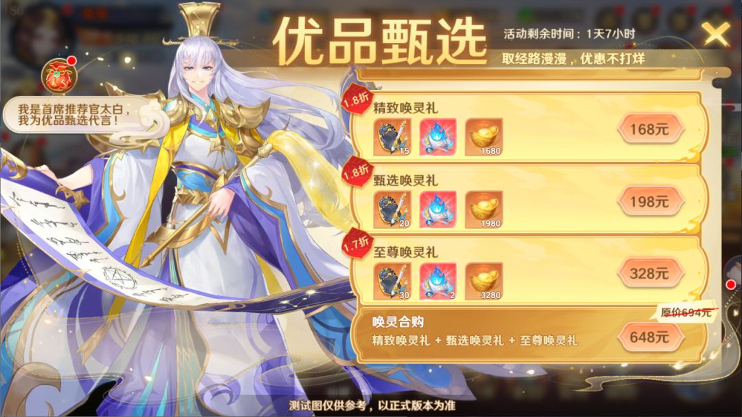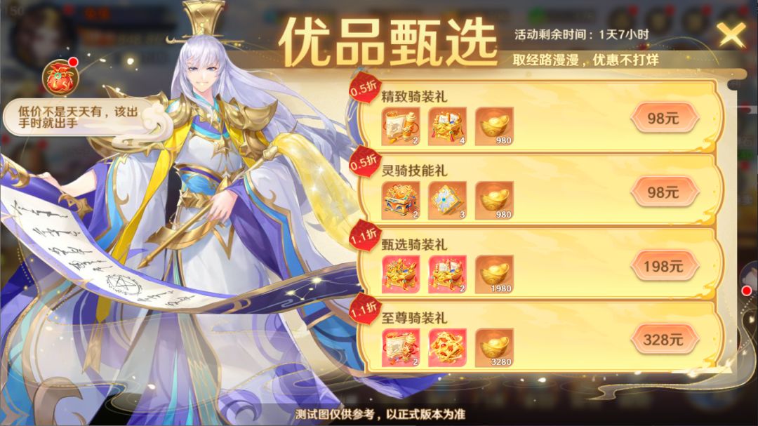 *合购礼包需要组合购买,单独购买组合内商品将放弃合购优惠。*每日在优品甄选活动中进行签到可获得元宝*300。