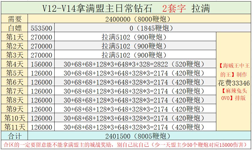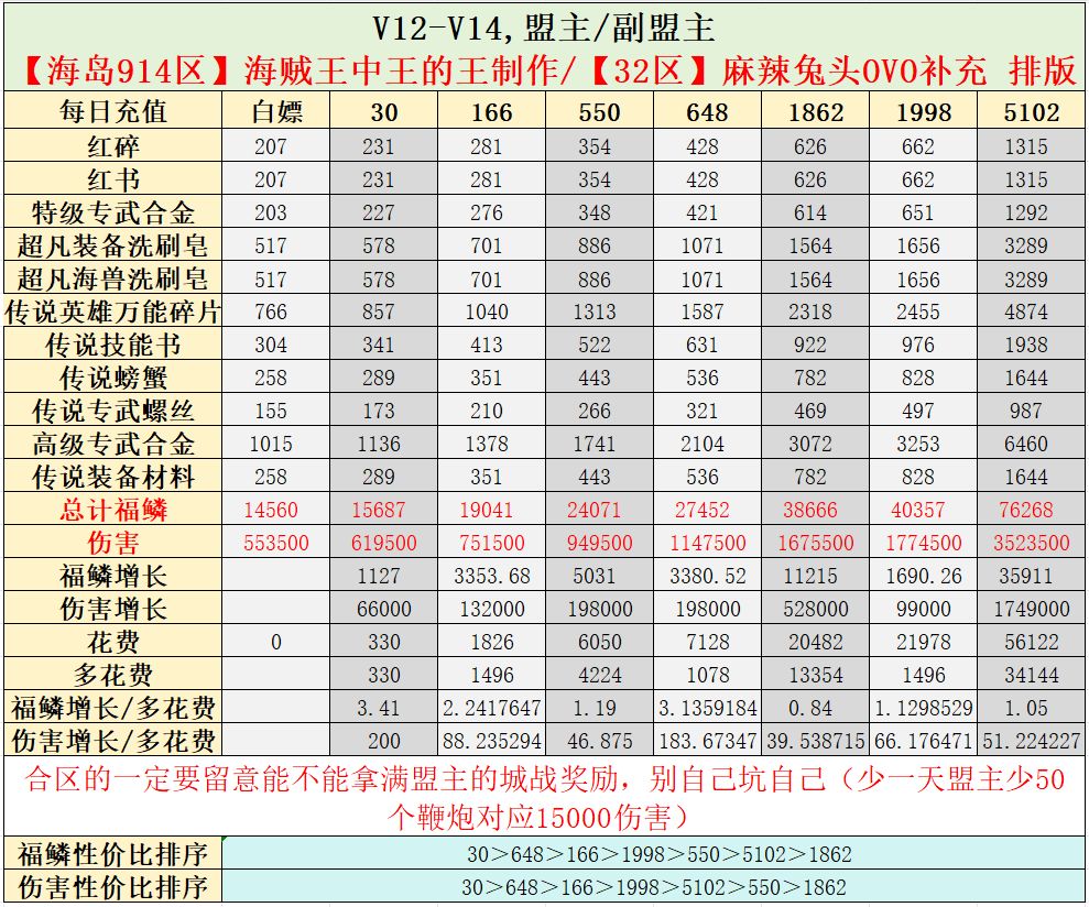 1、白嫖玩家,非联盟管理:550+330+104+200+11=1195,大约1195*300=35.85万的伤害(550是城战,330是扫荡-VIP不够的玩家可以自行往下降,104是签到任务和每日任务,200是钻石消耗,11是每天免费的1个)2、白嫖玩家,联盟管理:1100+330+104+200+11=1745,大约1745*300=52.35万的伤害3、每天充30+68+68:166每天可以拿60个,11*60=660,1745+660=2405,大约2405*300=72.15万的伤害(成本11*166=1826)4、拿船皮还差6W,大约补2个648,也就是成本是1826+648+648=3122,3000块钱,可以拿船皮5、拿称号90W,我们按照3的情况继续补,90-72=18W伤害,就是差6个648,成本就是1826+6*648=5714,6000块钱拿称号6、拿春字,要144W,此时每天肯定能做到800块钱了,每天累充会多30个,这就11天节约3个648,144-72=72W伤害,72/3=24个648,节约3个,就是21个648,所以拿新春祝好运的成本是1826+21*648=15434,其中大约有4天左右能到1998多30个,所以再少一个648,差不多1W57、拿界字,要168W,对比144W,就是多24W,也就似乎8个648,所以8*648=5184,拿“疯狂水世界”的成本就2W块钱总结,本期活动,拿满,保证每天达标648的情况下,2W拿满“新春祝好运”+“疯狂水世界”的集字奖励