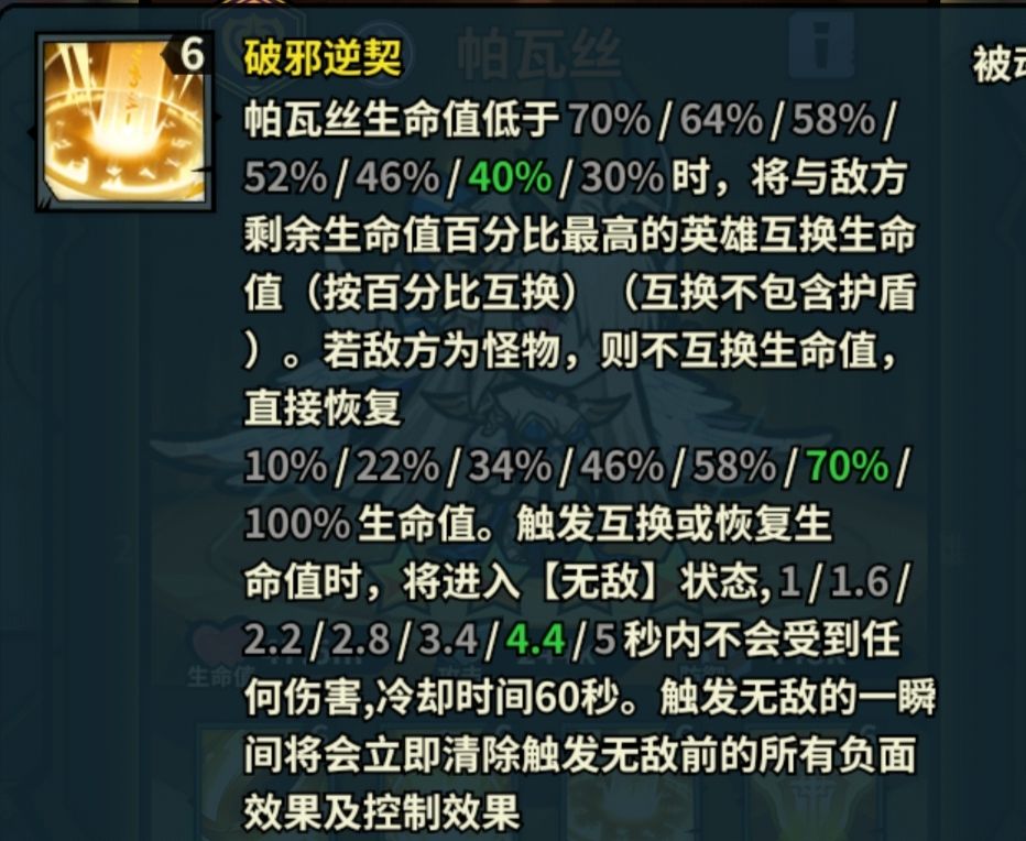 优点:这技能有两种状态,第一种和对面血量剩余最高的互换生命百分比(适合pvp和远征等有英雄的场景)第二种直接恢复生命值(适合地下城等没英雄的场景)。不过不管是哪种状态都会进入无敌状态。