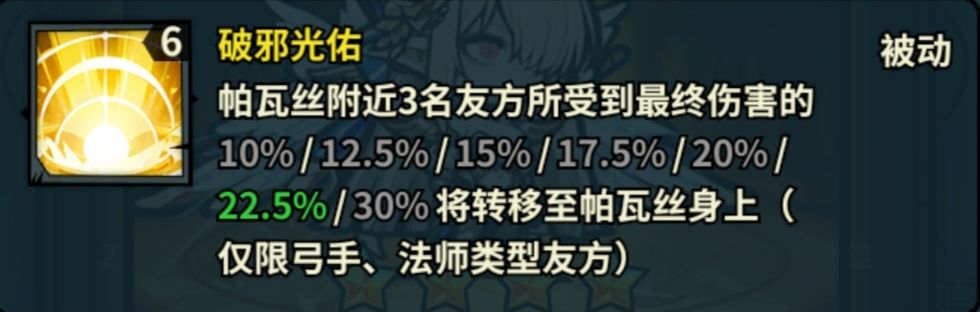 优点:帕瓦丝的特色核心技能,小镇首个分摊伤害的技能,可以有效提高队伍的后排生存力。很多人就是冲着这个技能入手帕瓦丝。