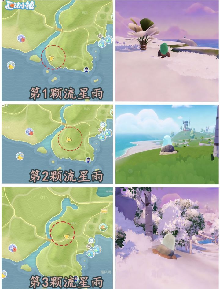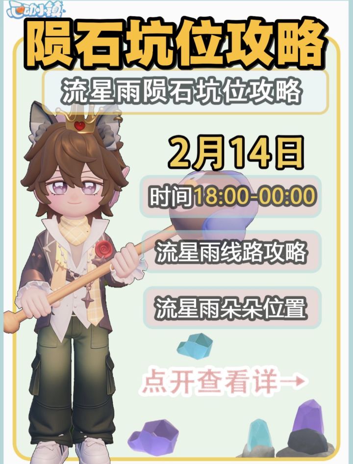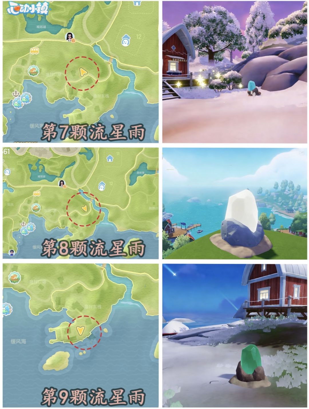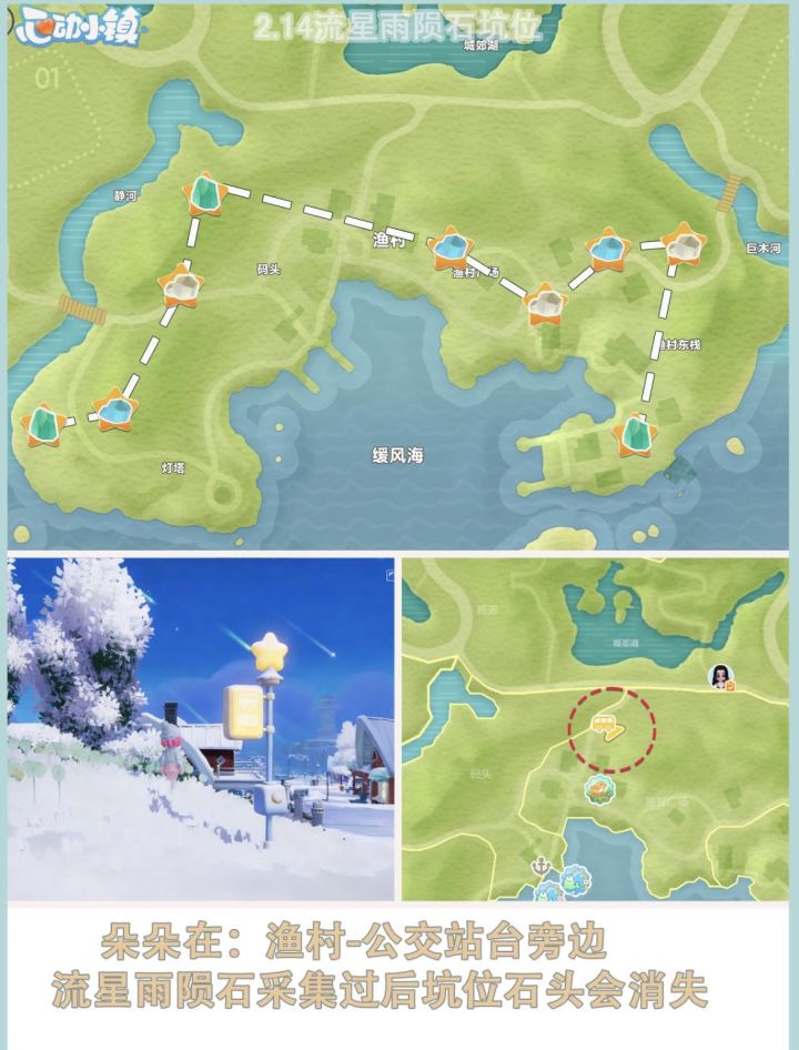 2月14日流星雨活动时间为18:00-00:00,是获取陨石和完成任务的关键时段。朵朵位于渔村-公交站台旁边,可顺路完成互动任务。推荐按图示路线依次采集9颗流星雨陨石,覆盖灯塔、码头、渔村广场、缓风海等区域,确保不遗漏。采集后陨石坑会消失,建议一次性走完路线。优先完成朵朵互动,再按顺序采集陨石,效率最高。