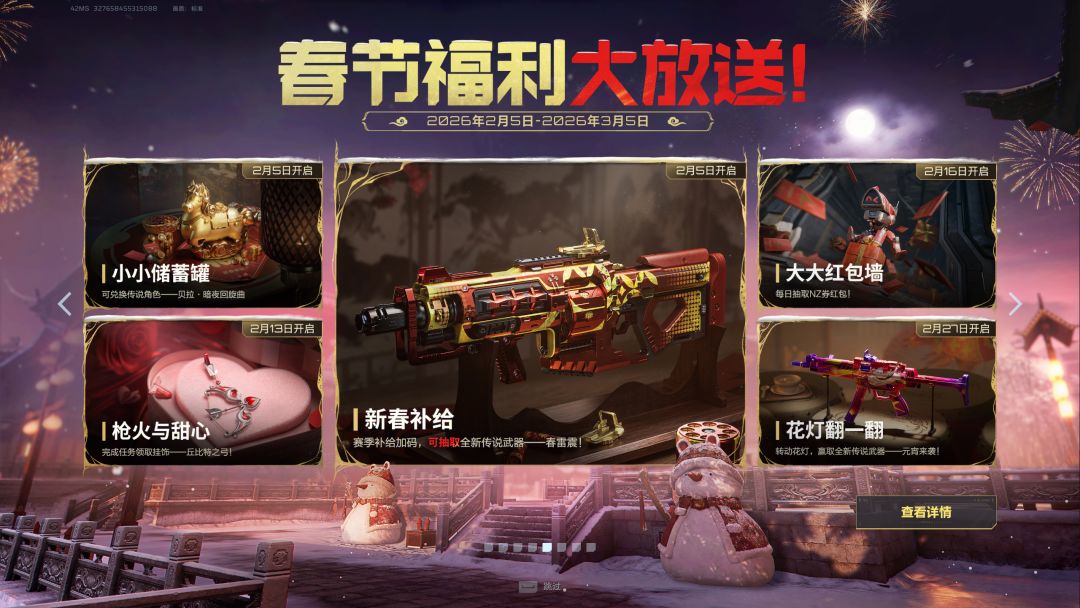 本次春节福利分为五个板块:新春补给、小小储蓄罐、枪火与甜心、大大红包墙及花灯翻一翻。完成各板块任务可获得穿梭招募凭证、赛季补给箱、蛇纹密券等道具,用于兑换丰富奖励。