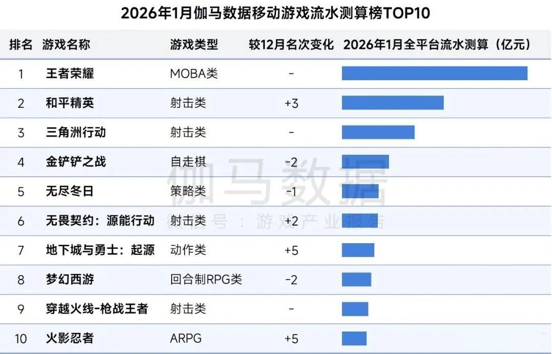 伽马发布2026年1月移动游戏流水测算榜TOP10