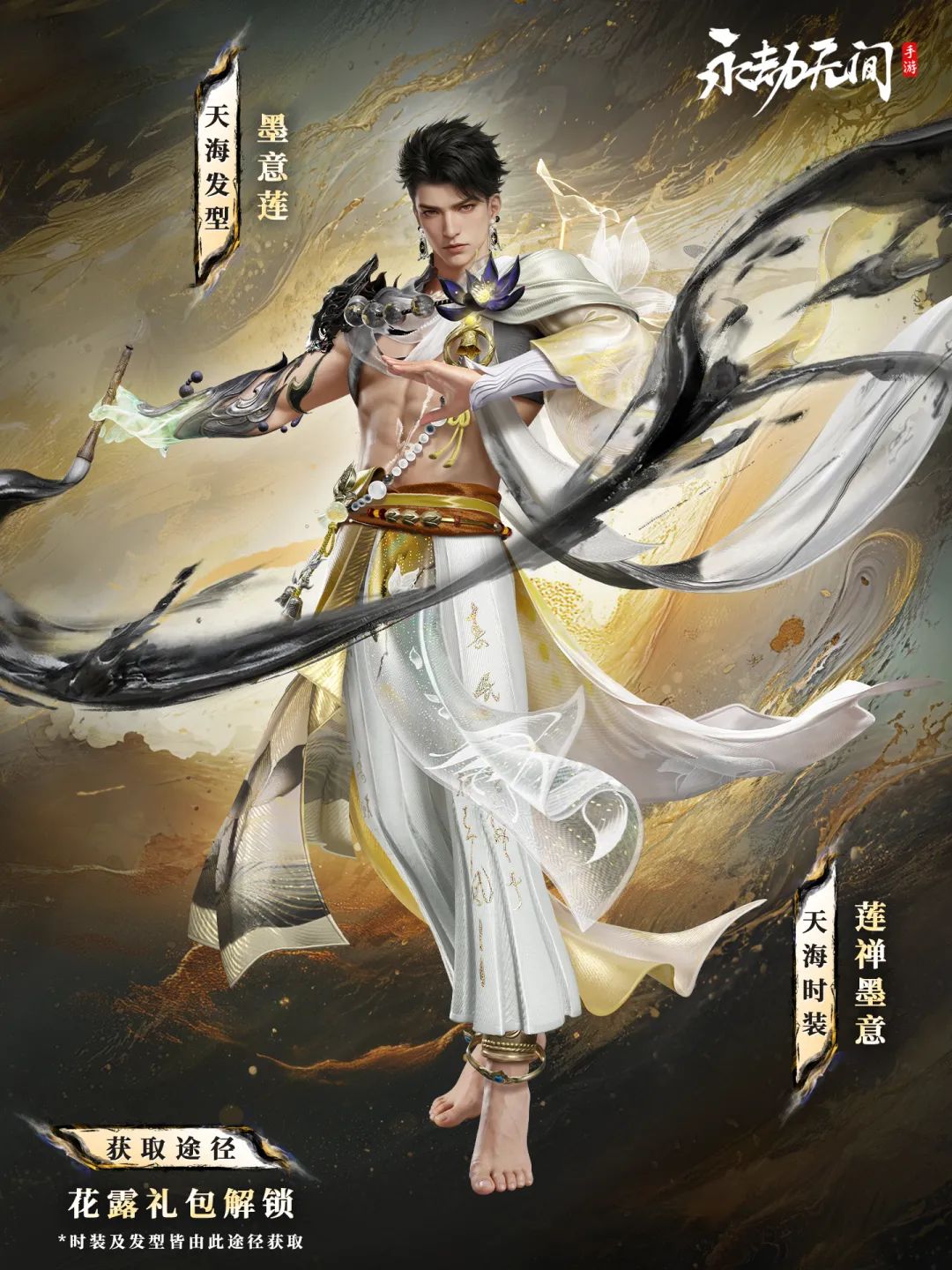 礼包包含:天海极品时装【莲禅墨意】、天海极品发型【墨意莲】以及极品头像【莲生禅】。