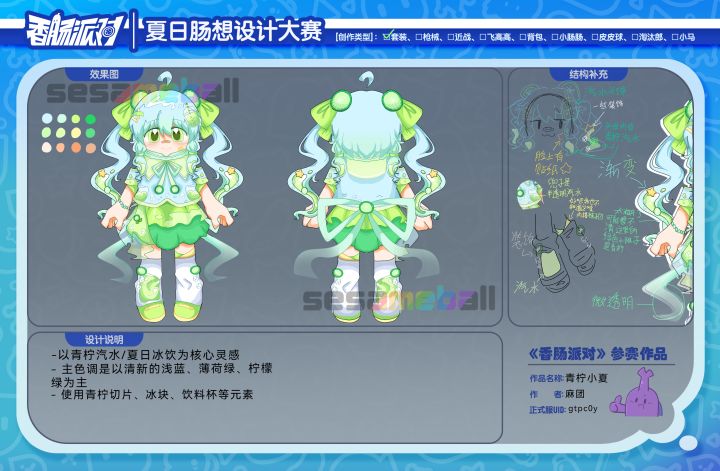【设计灵感】:来源于青柠汽水,双马尾头发有参考(这个设定好像烂大街了...)其中发丝的气泡和冰块,增强“汽水”的真实感