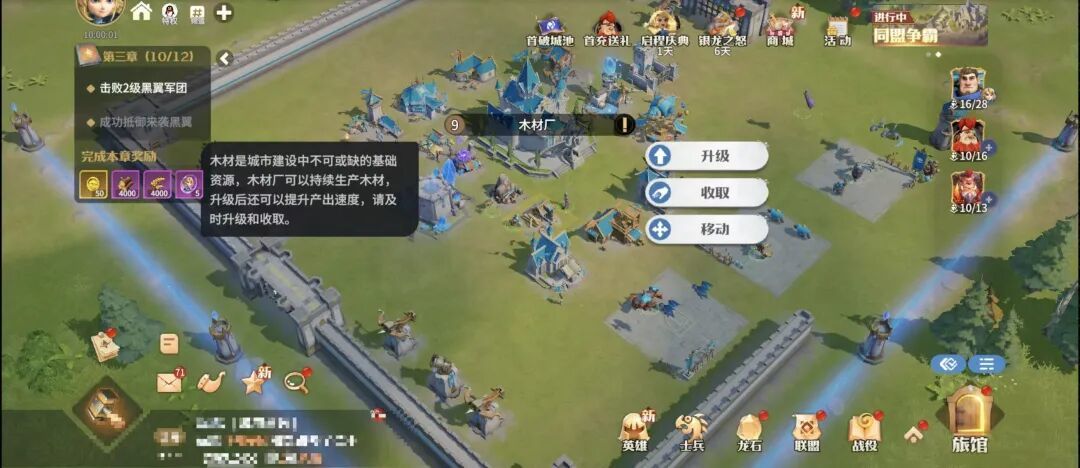 在资源建筑升级方面,矿厂与木材厂的等级直接决定单位时间产量,将这两类建筑等级紧跟主城等级同步提升,系统便会自动提高其基础产出效率。建议各位领主每次上线后,第一时间收取矿厂与木材厂的资源,避免资源溢出浪费。
