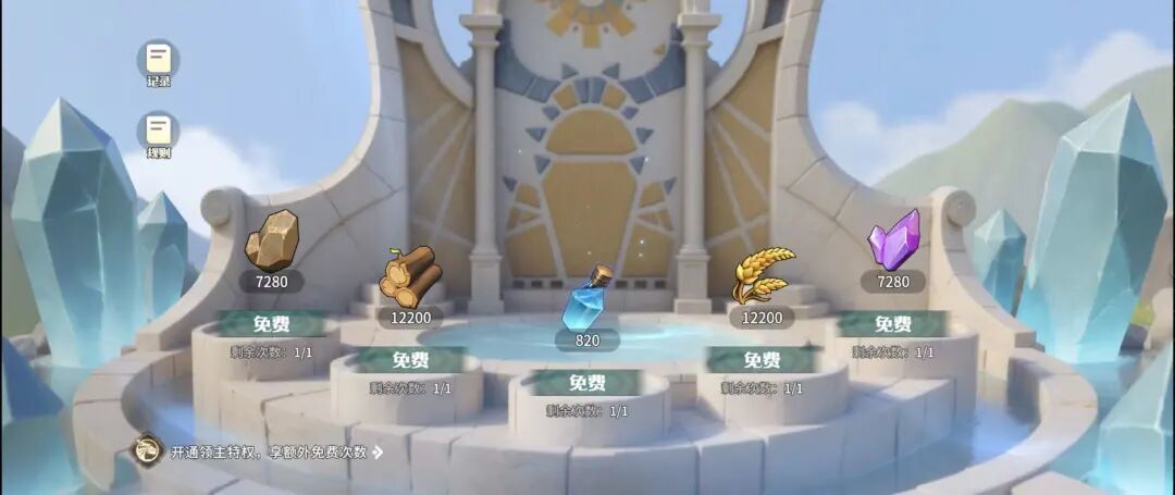 龙巢资源秘境是铜木资源的重要补充渠道。每日通过该秘境,可稳定获取“昨日资源建筑产速×1.2 + 5000”的安全资源;若开通领主特权,还能额外享受免费挑战次数,进一步提升资源收益。