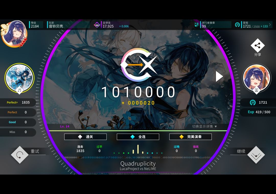 同时今天下午,把四合星座理论了,成为了我第二个理论的14.4,又是一个重大成就,同时也完成了支线IV难度全理论制霸(α难度还没有),非常开心,真的还能再走下去吗