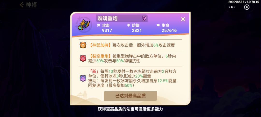- 效果:朝前方2名敌人轰800%物理伤害,附带打断+击退,还能针对前排战士(刑天、刘备)的回血和防御加成。