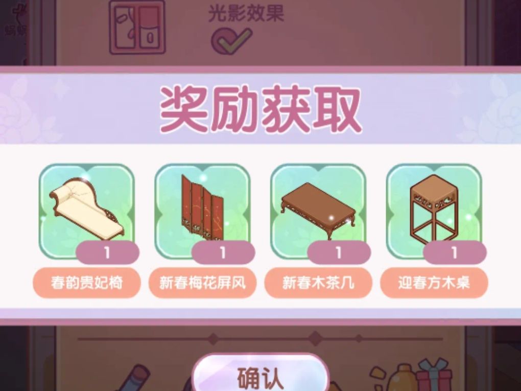 春韵贵妃椅×1、新春梅花屏风×1、新春木茶几×1、迎春方木桌×1