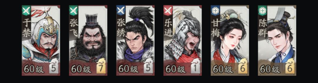 于禁、张飞、张绣、乐进、甘梅、陈群