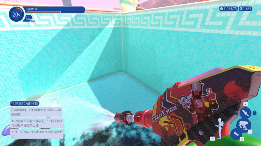 ①移除了清洁剂(皂液)的消耗品属性,使其变成了虽然有覆盖面积上限,但可以通过清洗掉已经喷涂的泡沫来恢复存量的可无限使用的道具(虽然角落里依旧摆了一台售货机)。而且,任何一种被皂液覆盖的污渍均仅需单次冲洗即可完全清洗干净,也就是说,在本作中,玩家不再需要因污渍过于顽固而反复斟酌喷嘴的选择,只要泡沫够多,冲就完事了。